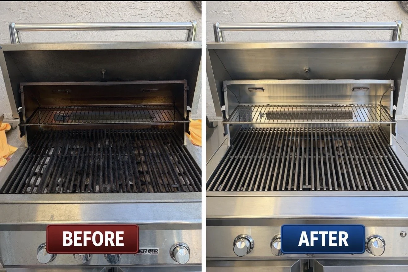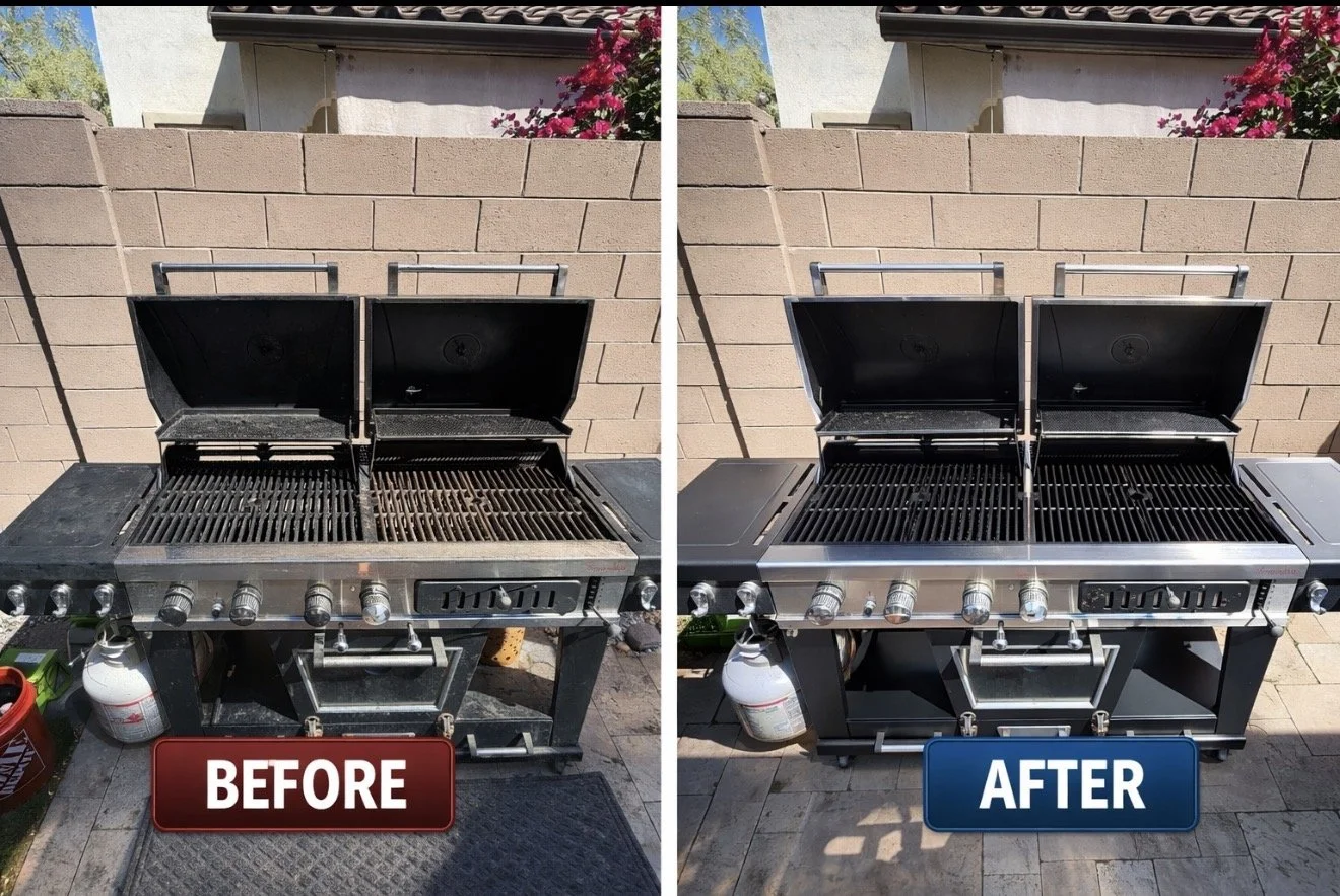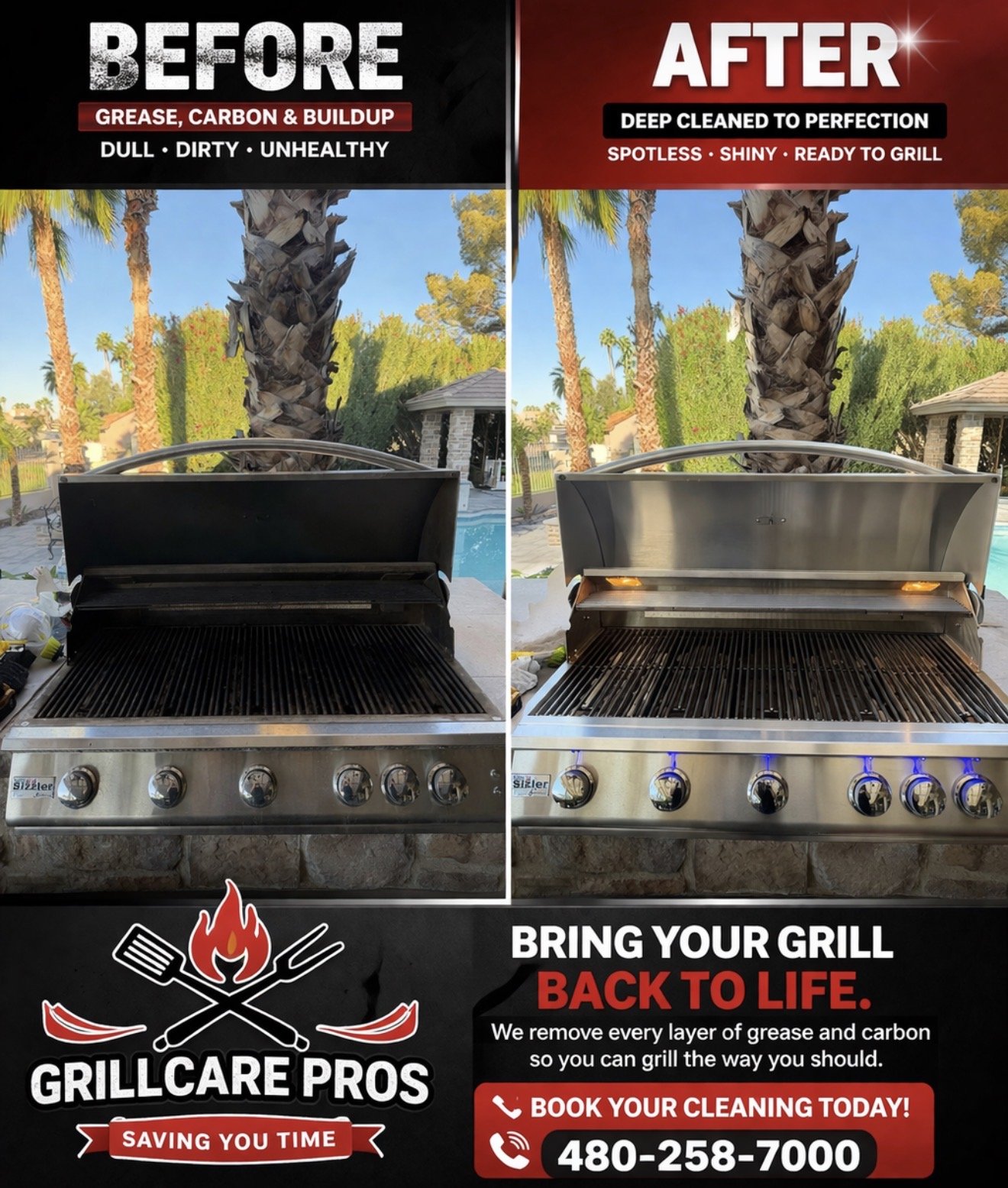 Professional BBQ grill cleaning in Phoenix, AZ. Remove grease, prevent fires, and restore your grill to a spotless stainless steel shine. Book your Grill Care Pros cleaning today!